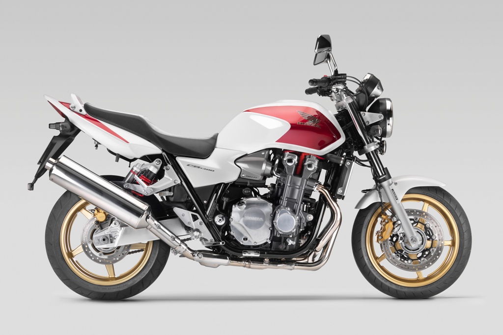 Diese Lackierung lässt die Maschine besonders elegant erscheinen und betont die gelungenen Proportionen vortrefflich. Alternativ bleibt die klassische weiß-rote Farbkombination natürlich im Programm, die überdurchschnittlich oft im Stammbaum vieler hubraumstarker Hondas zu finden ist. Beide Farbvarianten der verkleideten CB1300 sind mit goldfarbenen Felgen ausgestattet. Die offiziellen Farbbezeichnungen lautet Pearl-SunbeamWhite / Black und Pearl Sunbeam White / Arcadian Red.