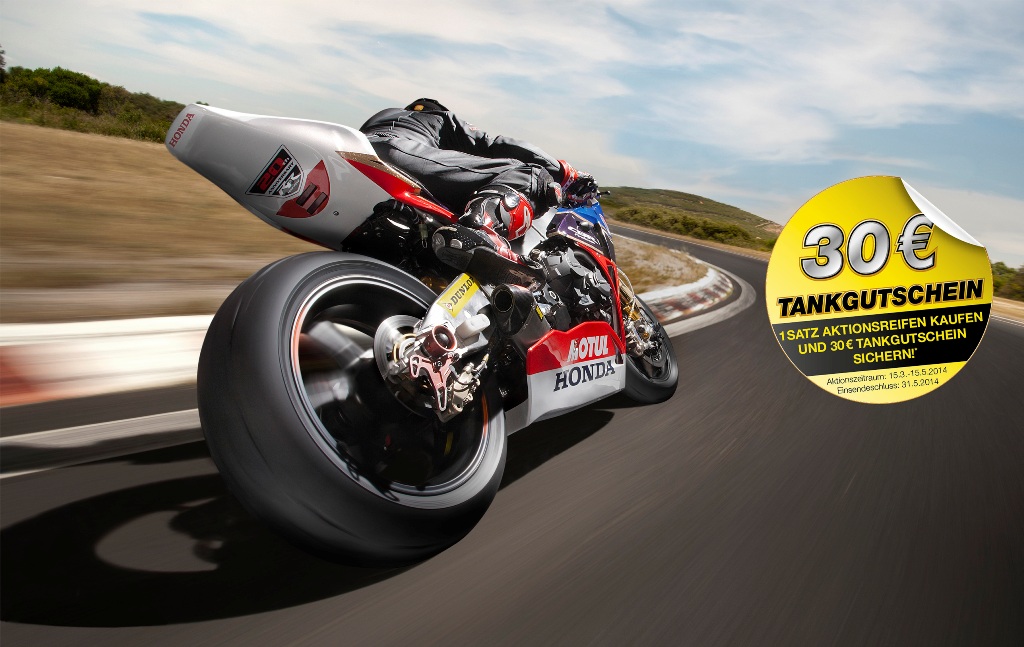 Zum Beginn der neuen Saison gibt Dunlop Motorradfahrern beim Reifenkauf einen Aral-Tankgutschein im Wert von 30 Euro dazu. Die Aktion gilt vom 15. März bis 15. Mai 2014 und für einen Satz der Aktionsreifen bei einem stationären Motorrad- oder Reifenhändler in Deutschland. Käufe über das Internet sind ausgeschlossen.